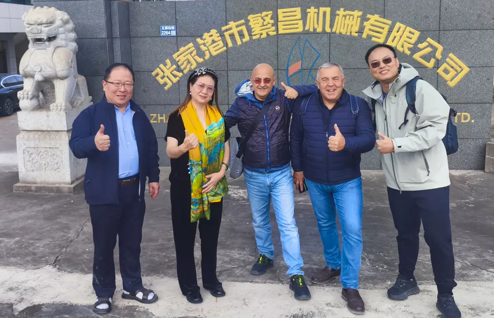 2025-ben az olasz LAMPLAST SRL cég két darab SRLW-1300/5000 teljesen automata hideg-meleg vegyes egységet vásárolt cégünktől. A képen ennek a cégnek a két főnöke látható, amint a késztermékeket ellenőrzi gyárunkban.